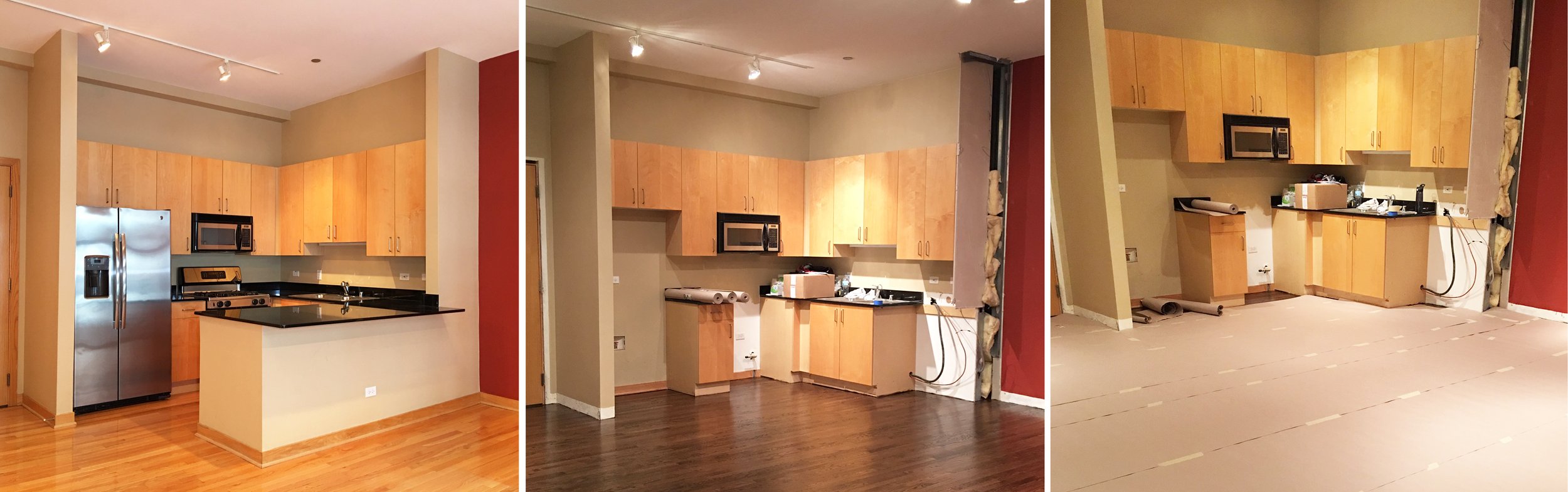Here's a peek at the transformation of the space so far... really just floors and a disappearing kitchen, but it's something!